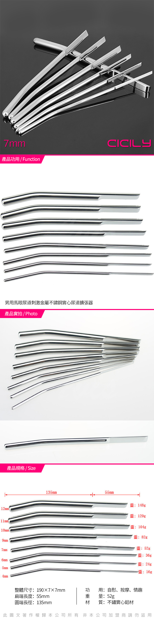 .商品內容:虐戀精品CICILY 金屬不銹鋼 實心尿道擴張器 男用馬眼刺激 02 7mm