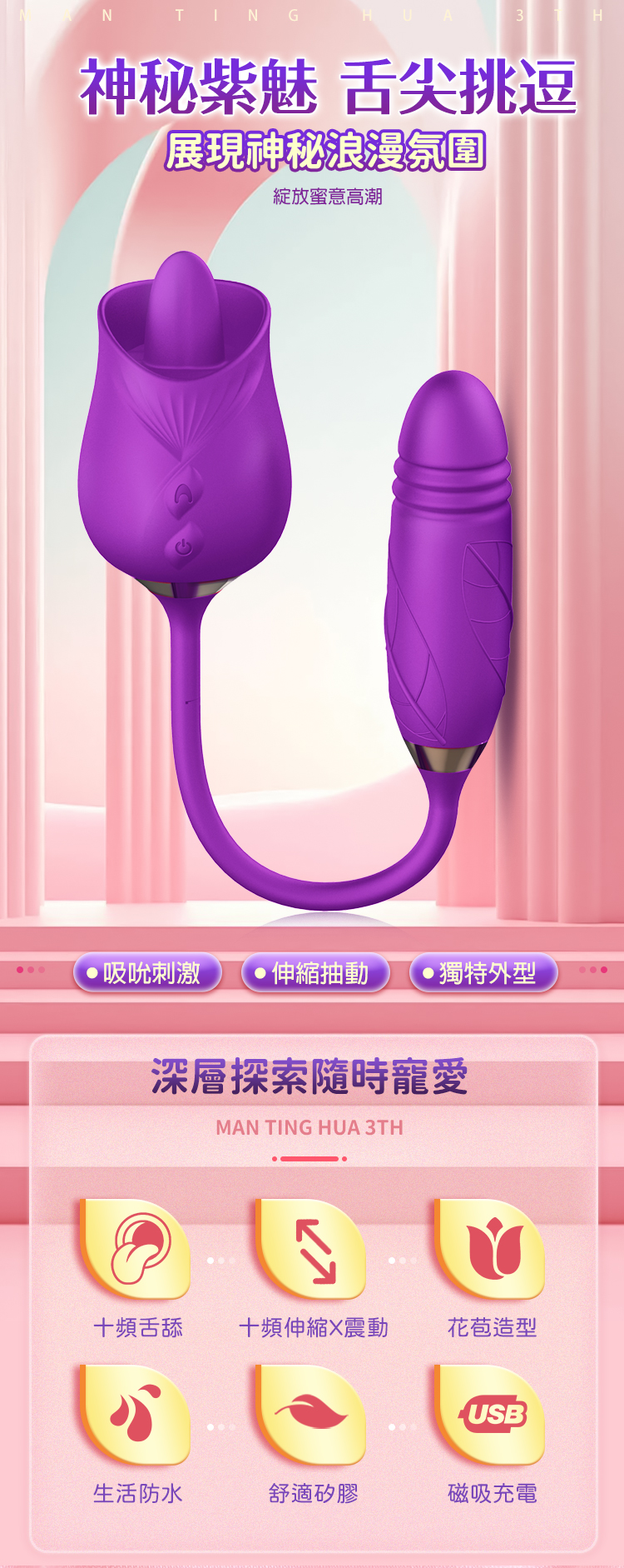商品名稱:滿庭花3代|雙頭舌撩|伸縮震動棒 紫